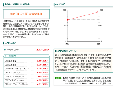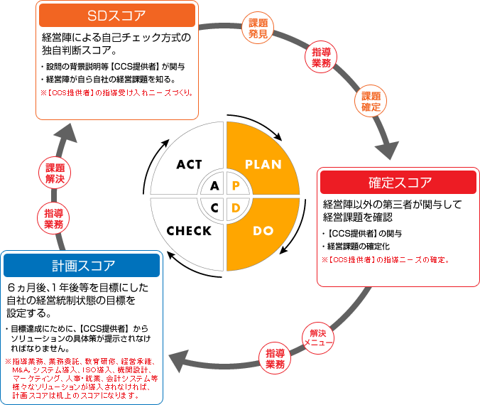 CCS経営統制スコアとは未上場企業における経営評価を【見える化】と【比較データ】【参考情報】の提供で行います。 ISO26000を骨格としてスコア算定します。 ・経営基盤力 ![]() 経営目標像を経営者に提示して、現在とのGAP情報を提供します。 (1)持続型経営が可能な企業像 ![]() スコアの種類は3タイプでPDCAを採用しています。 財務データから経営評価を行う経営チェックは1年に1回で十分ですか、企業活動全般の評価システムであるCCS経営統制スコアは、セルフドック(SDスコア)チェックで自己評価を行い、確定スコア、計画スコアを繰り返して活用すことがポイントです。その際、CCS提供者の助言・指導が活かされます。 ![]() |